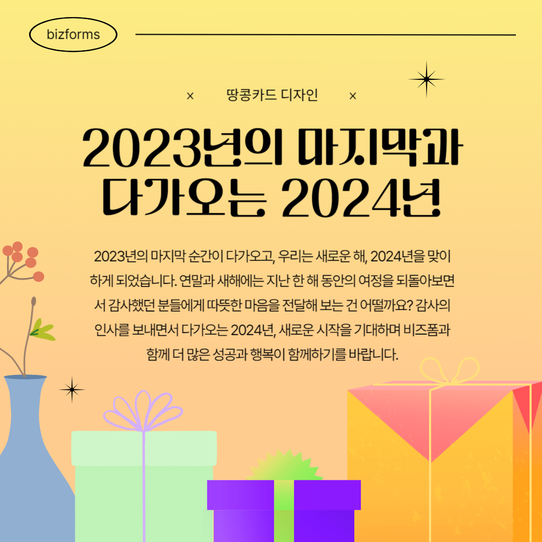 2023년의 마지막 순간이 다가오고, 우리는 새로운 해🌞, 2024년을 맞이하게 되었습니다. 연말과 새해에는 지난 한 해 동안의 여정을 되돌아보면서 감사했던 분들에게 따뜻한 마음을 전달해 보는 건 어떨까요? 감사의 인사를 보내면서 다가오는 2024년, 새로운 시작을 기대하며 비즈폼과 함께 더 많은 성공과 행복이 함께하기를 바랍니다.🙇♀️