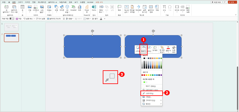 ③ [Shift] 키를 누른 채 복제한 두 도형을 클릭하고 오른쪽 마우스를 통해 [채우기]-[스포이트]를 선택하여 대지 배경과 동일하게 변경할 수 있도록 대지를 클릭합니다.