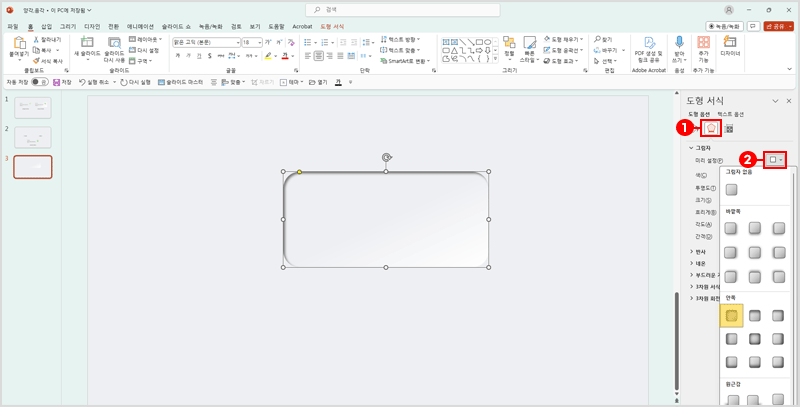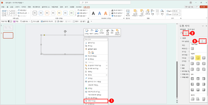 ④ 가장 먼저 첫 번째 도형을 선택한 후 오른쪽 마우스를 클릭하고 [도형 서식]을 선택, 그러면 오른쪽에 나오는 회색 창에서 두 번째 아이콘인 [효과]-[그림자]-[미리 설정]을 차례대로 클릭하고 오프셋 : 아래쪽 선택합니다.