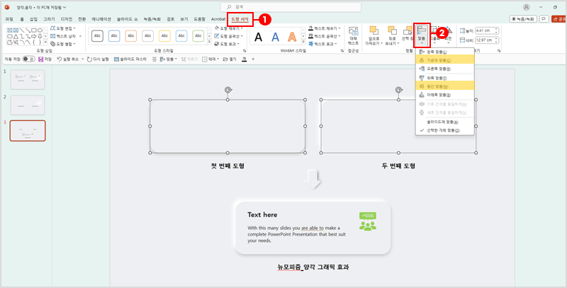 ⑧ 마지막으로, 그림자 효과가 적용된 첫 번째와 두 번째 도형를 [Shift] 키를 누른 채 [도형서식]-[맞춤]을 선택, 그리고 가운데 맞춤과 중간 맞춤 두 가지를 누르고 그룹화(Ctrl+G) 시켜주면 양각 그래픽 효과가 완성됩니다.