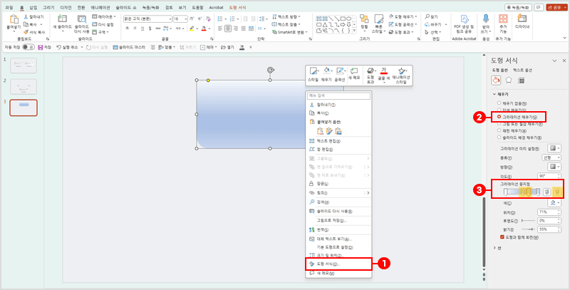 ③ 도형을 선택한 후, 우클릭하여 [도형서식]을 선택합니다. 오른쪽의 회색 창에서 [채우기 및 선]을 선택하고, [그라데이션 채우기]를 클릭합니다. 그 후, 가운데에 위치한 두 그라데이션 중지점을 선택하고 [그라데이션 중지점 제거]를 클릭하여 제거합니다.