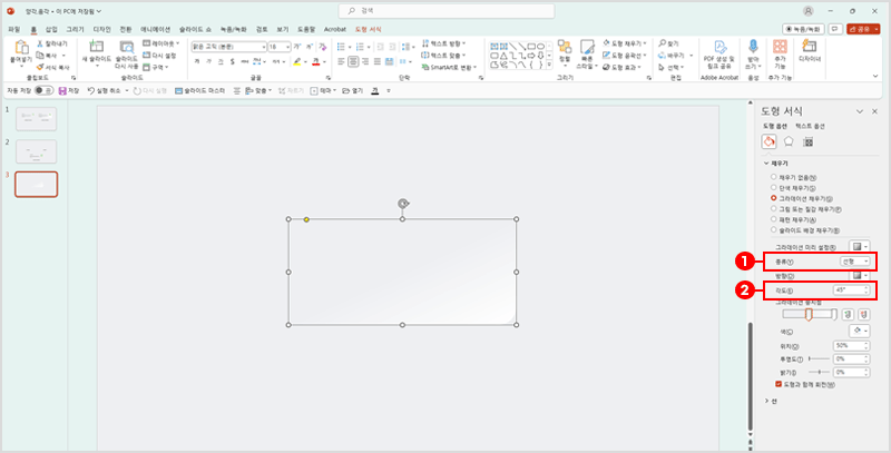 ④ 그라데이션 종류를 선형으로 변경하고, 각도를 45°로 설정합니다.