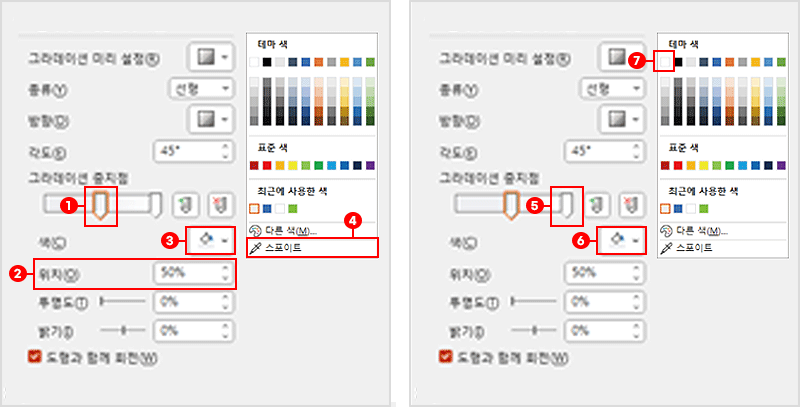 ⑤ 남아있는 중지점 중 왼쪽 중지점의 위치를 50%로 조정하고, 색상은 스포이트를 활용하여 대지와 동일한 색으로 변경합니다. 오른쪽 중지점의 색상은 흰색으로 변경합니다.