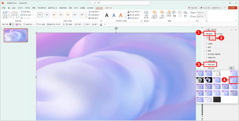 4️⃣ 첫번째 이미지를 선택하고, 이번에는 ① 도형옵션에서 [② 효과]를 클릭하고 [ ③꾸밈효과]에서 ④ 흐리게를 선택하고 반경을 입력합니다.