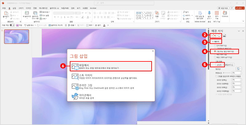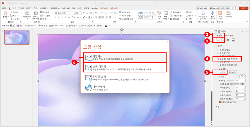 2️⃣ 사각 도형을 선택 후, 오른쪽 마우스를 클릭하여 [① 도형서식]을 선택합니다. 오른쪽에 나오는 회색 창 ② 도형옵션에서 [③ 채우기 및 선] - [④ 그림 또는 질감 채우기] - [⑤ 삽입]을 순서대로 클릭합니다. 이렇게하면 [⑥ 파일에서 또는 스톡 이미지]를 통해 원하는 이미지를 선택할 수 있는 창이 나옵니다. 여기서 원하는 이미지를 선택하여 적용합니다.
