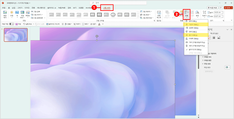 7️⃣ 대지 배경을 흐린 이미지로 불러 왔나요? 그렇다면 조금 이동 시켰던 깨끗한 두번째 이미지를 다시 대지 위에 가운데 맞춤, 중간 맞춤을 통해 이동 시켜줍니다.