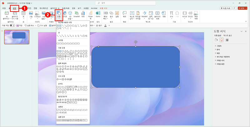 8️⃣ 이미지 위에 [①삽입} - [②도형]을 클릭하여 원하시는 도형을 만들어 줍니다.