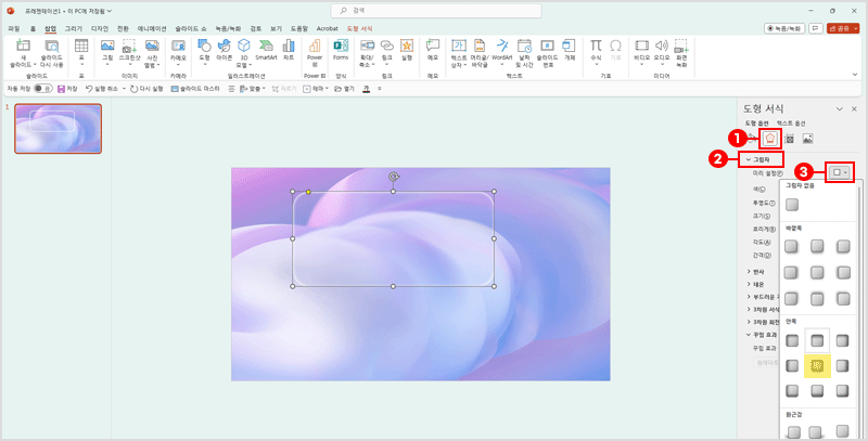 위치에 따라 배경이 다르게 채워지는 것이 보이시면 파워 포인트에서 글래스모피즘 그래픽 효과 완성입니다.