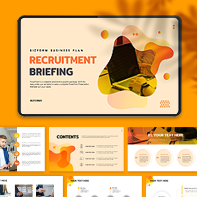 긍정적인 이미지를 전달할 수 있는 주황 컬러와 도형 이미지를 활용한 템플릿으로 기업 채용 설명회를 진행할 때 필요한 정보를 직관적이고 전문적으로 전달할 수 있습니다.