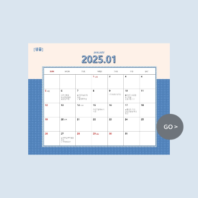 월별 달력은 가로형과 세로형 두 가지 종류가 있으며 첫 번째로 가로형 월별 달력에 대해 살펴보겠습니다. 첫 번째 월별 달력은 데스크매트용으로서 월별 일정을 기록하며 관리할 수 있습니다.