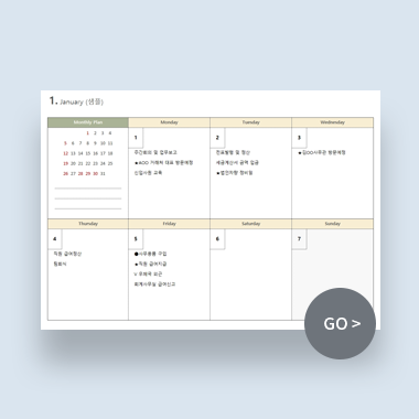 월간 달력은 한 달 전체를 파악하여 장기적인 계획 수립에 유용하며, 월별 목표와 성과를 확인할 수 있습니다. 심플하게 기록하여 빠르게 계획을 세우고 수정할 수 있습니다. 한 달 흐름을 파악하고 큰 이벤트를 계획해야 한다면 월간 달력을 사용해 보세요💁🏻♀️