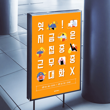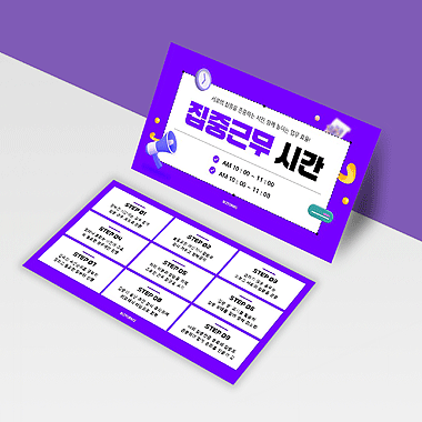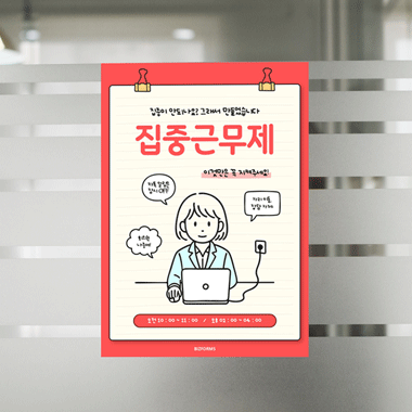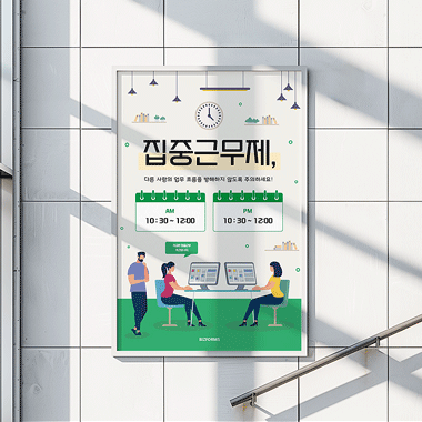 집중 근무 문화를 시각적으로 조성하는 디자인 패키지입니다. 포스터, 탁상형 카드, SNS 프로필 이미지로 구성되어 온·오프라인 모두 집중 근무 시간을 알릴 수 있습니다.