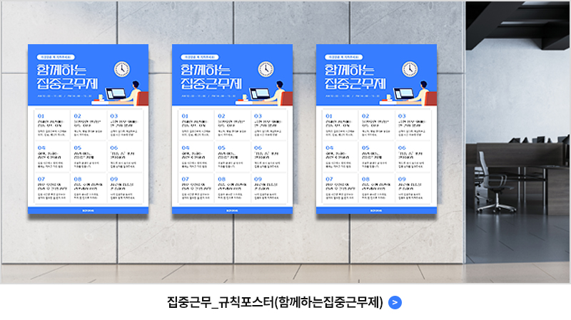 이러한 기대효과를 위해서는 기업 구성원 전체가 실천할 수 있는 환경 조성이 필요합니다. 집중 시간을 명확히 정하고, 회의·메신저·이메일 등 방해 요소를 최소화하며, 관리자와 구성원이 함께 ‘집중하는 문화’를 만들어가야 합니다. 또한 시각적으로 일관된 메시지와 디자인을 통해 구성원이 집중근무제의 의미를 쉽게 인식하고 참여할 수 있도록 해야 합니다.