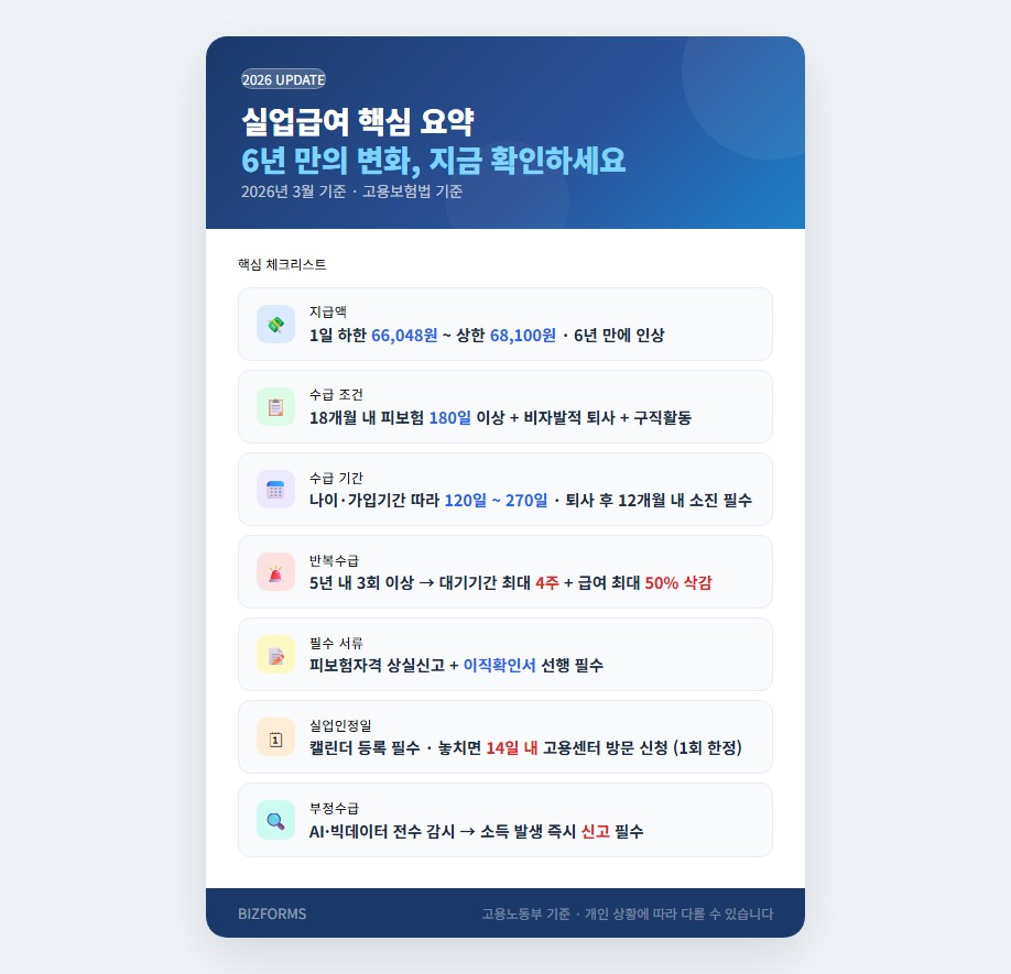 받을 수 있는 금액도 달라졌고, 반복 수급에 대한 패널티도 훨씬 강해졌으며, 부정수급 단속 시스템도 AI와 빅데이터를 활용한 전방위 체계로 고도화 됐습니다. "대충 알고 있으면 되겠지" 싶었던 분들도 지금은 꼼꼼하게 확인해야 할 시점입니다. 이번 콘텐츠에서는 2026년 3월 기준, 실업급여의 A부터 Z까지 한 번에 정리해 드릴게요!