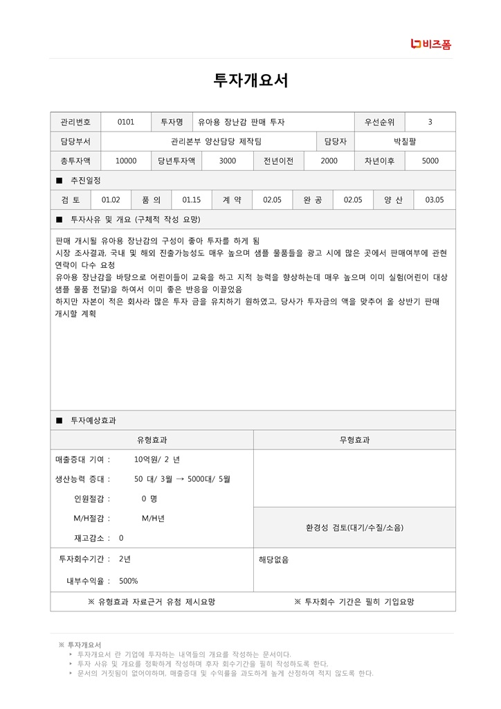 ÅõÀÚ »çÀ¯ ¹× °³¿ä¿¡ ´ëÇÏ¿© ±¸Ã¼ÀûÀ¸·Î ÀÛ¼ºÀ» ÇÏ¿©¾ßÇϸç, ÅõÀÚ ¿¹»óÈ¿°ú¿Í ÅõÀÚ È¸¼ö±â°£, ¼öÀÍÀ²À» °í·ÁÇÏ¿© ÀÛ¼ºÇϵµ·Ï ÇÑ´Ù.