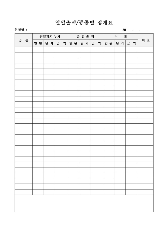 공종별,전일까지 누계,금일출역,누계를 기록하는 일일출력,공종별집계표입니다.