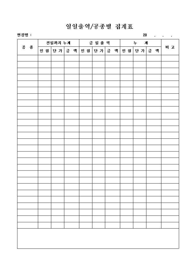 공종별,전일까지 누계,금일출역,누계를 기록하는 일일출력,공종별집계표입니다.