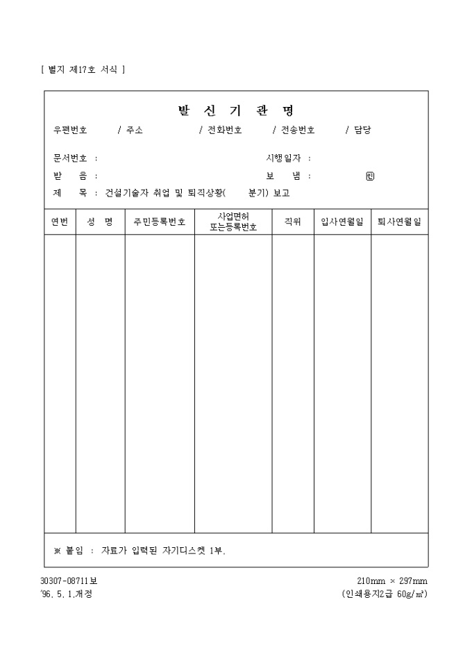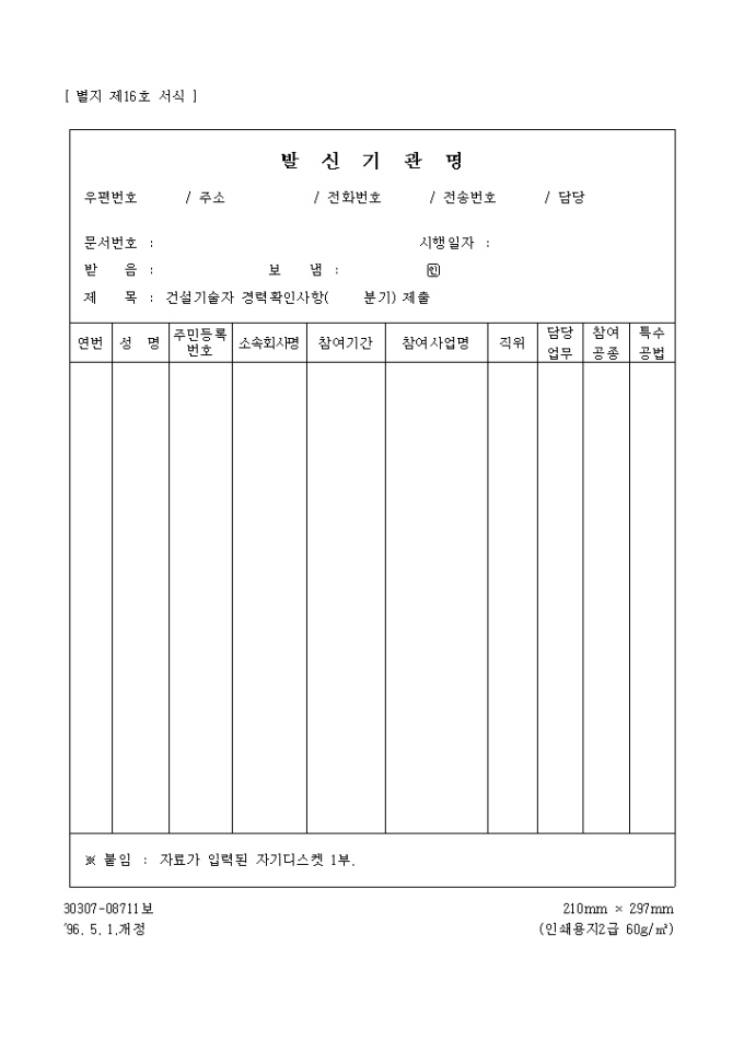 9,000원/월별지 제16호 서식으로 기술자인적사항,경력 내용등을 기재하는 기술자 경력확인원입니다.