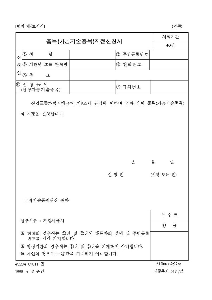 품목(가공기술종목)지정신청서