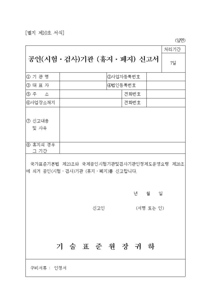 공인(시험,검사)기관 (휴지,폐지) 신고서