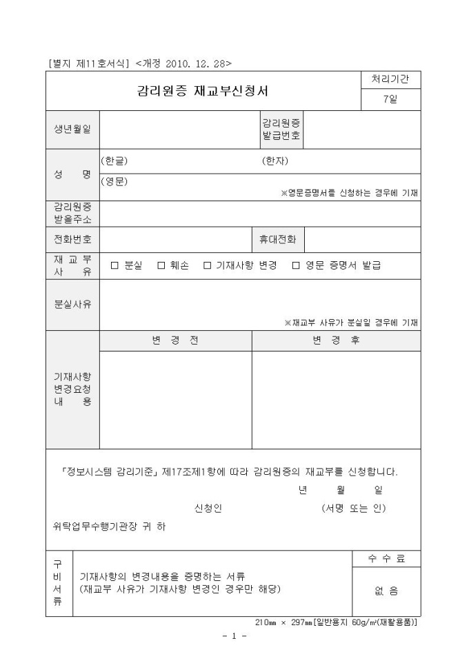 감리원증 재교부신청서