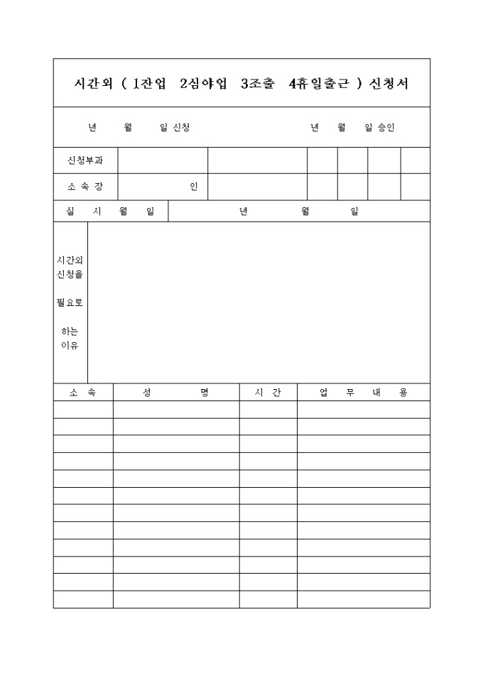 9,000원/월시간외 잔업,심야업,조출,휴일출근 신청서입니다