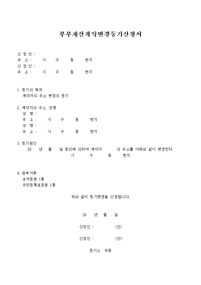 9,000원/월부부 재산 계약변경 등기를 신청할 때 사용하는 양식으로 등기의 목적, 계약자의 주소, 성명, 등기원인등을 기입하도록 되어 있고 첨부서류로는 호적등본 1통, 주민등록표등본 1통이 있습니다.