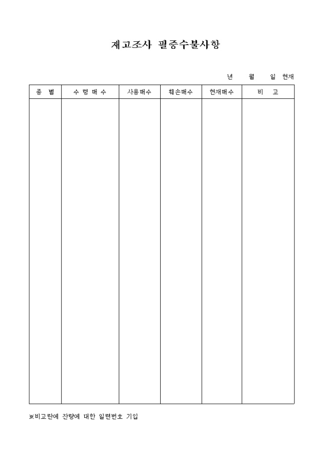 9,000원/월종별,수령매수,사용매수,훼손매수,현재매수로 구성되어 있는 재고조사 필증수불사항 양식입니다.