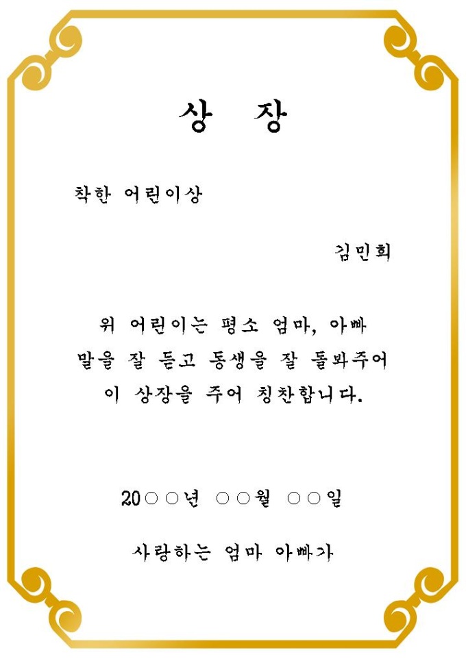상장문구와 디자인이 포함된 상장 샘플입니다. 상황에 맞게 활용하실 수 있습니다.