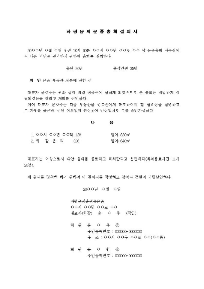 문중총회결의서 (부동산 매수의 경우, 규약에 총회의 결의에 의한다고 명시된 경우)