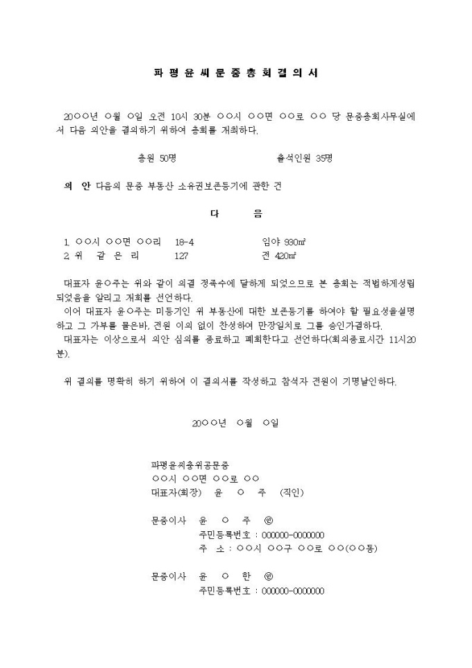 9,000원/월문중총회결의서 (소유권보존의 경우, 규약에 총회의 결의에 의한다고 명시된 경우)입니다.