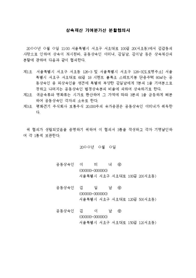 상속재산 기여분가산 분할협의서