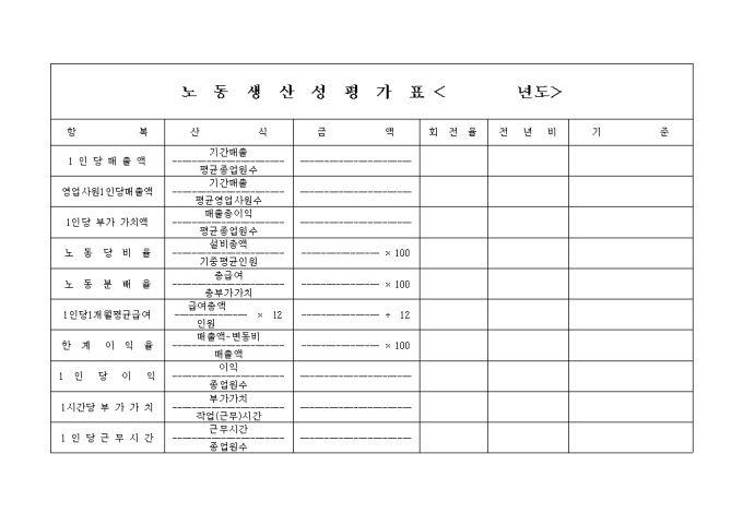 9,000원/월종업원 1인당 노동생산성을 평가할수 있는 양식입니다. 1인당 매출액,영업사원 1인당 매출액, 1인당 부가 가치액, 노동당 비율, 노동분배율, 1인당 1개월 평균급여, 한계이익율, 1인당 이익, 1시간당 부가가치, 1인당 근무시간등을 평가합니다.