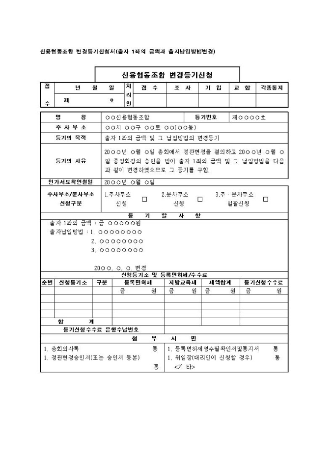 신용협동조합 변경등기신청서(출자 1좌의 금액과 출자납입방법변경)입니다.