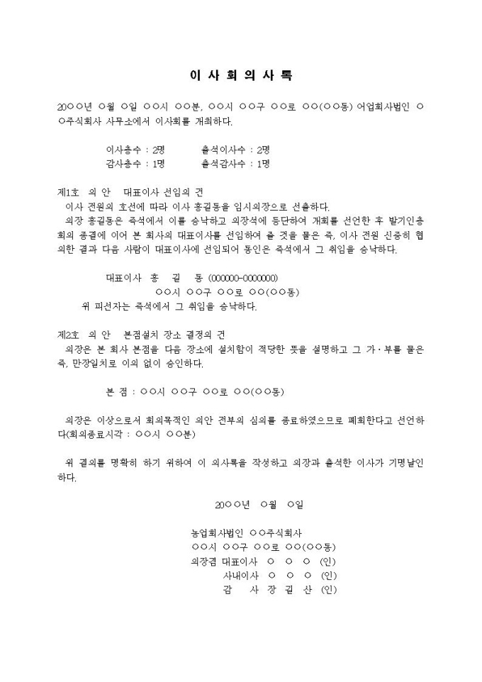 9,000원/월어업회사법인 주식회사 설립등기신청서(발기설립) [첨부서류 5] 이사회의사록(2)입니다.