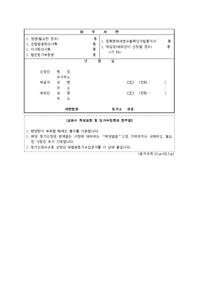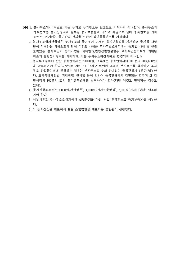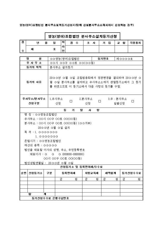 9,000원/월영농(영어)조합법인 분사무설치등기신청서(당해 신설분사무소 소재지에서 신청하는 경우)입니다.