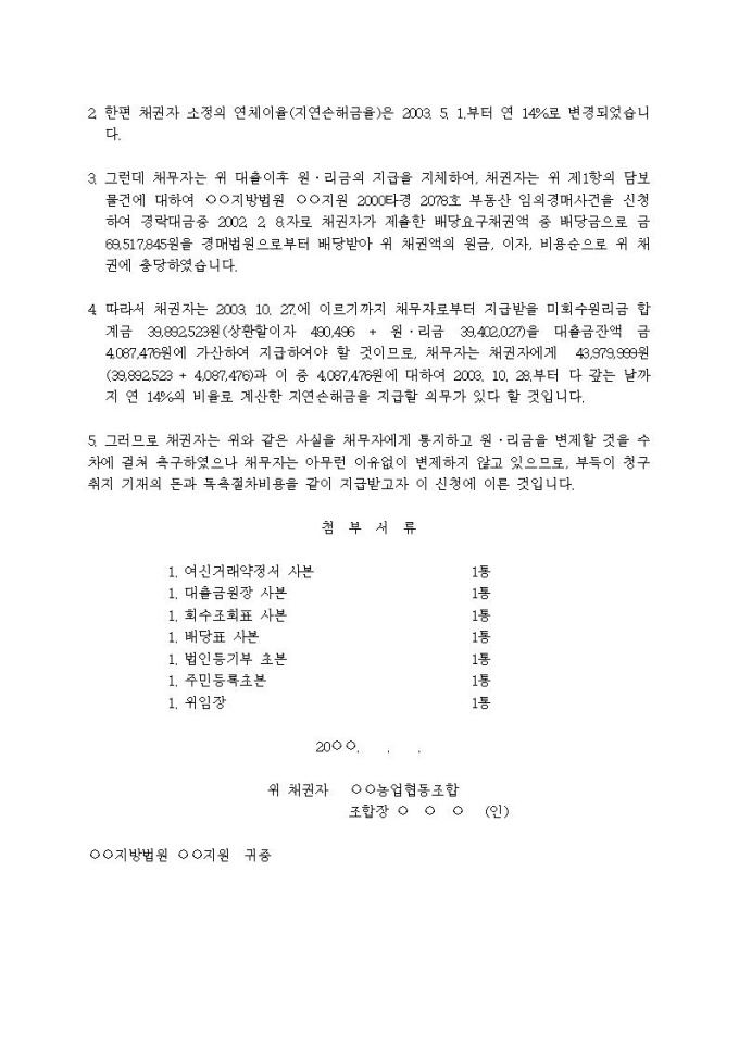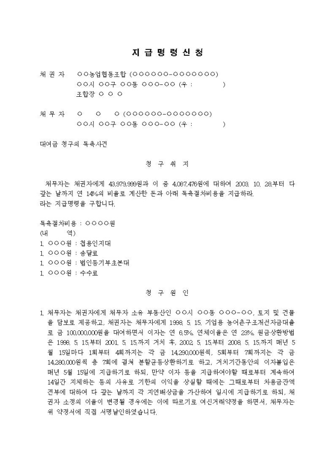 (지급명령신청서)대여금청구의 독촉사건(배당금에서 충당)입니다.