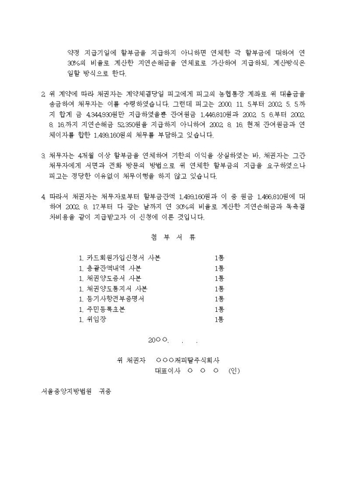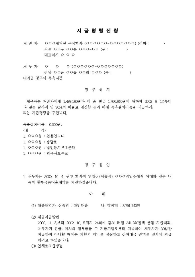 9,000원/월(지급명령신청서)대여금청구의 독촉사건(할부금)입니다.