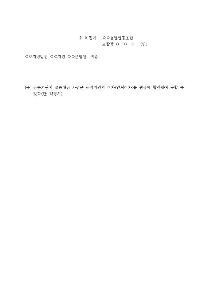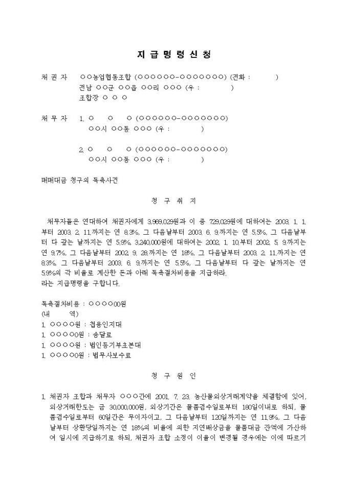 (지급명령신청서)매매대금청구의 독촉사건(농산물외상거래계약)입니다.