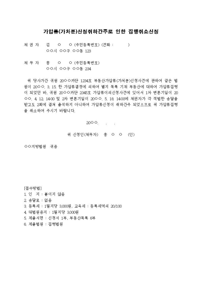 가압류(가처분)신청취하간주로 인한 집행취소신청입니다.
