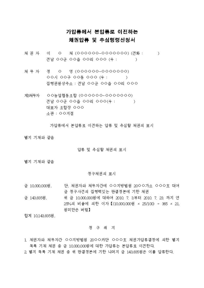 가압류에서 본압류로 이전하는 채권압류 및 추심명령신청서(3)입니다.