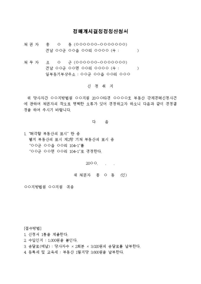 강제경매 결정경정신청서(부동산의 표시란)입니다.