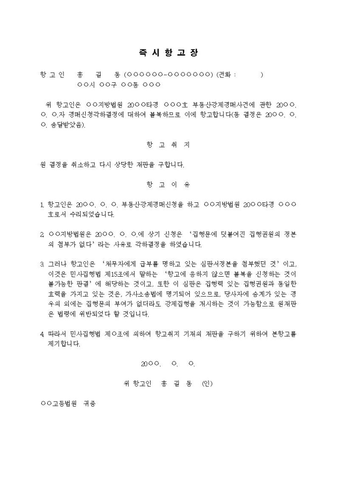 9,000원/월강제경매신청 각하결정에 대한 즉시항고장입니다.
