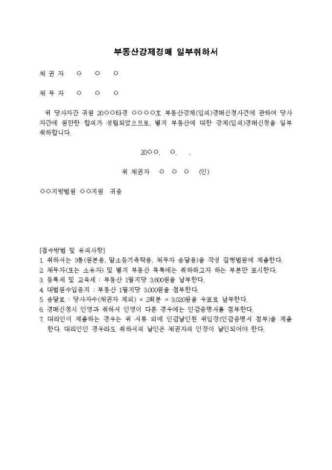 강제경매신청일부취하서(매수신고 전)