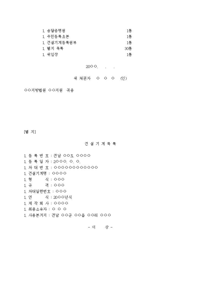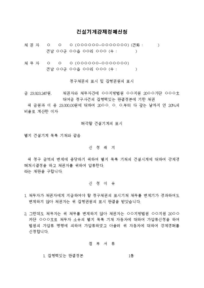 건설기계강제경매신청서입니다.