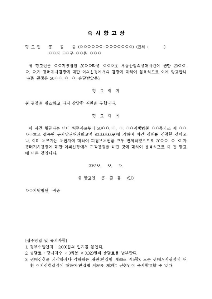 9,000원/월경매개시결정 이의의 기각결정에 대한 즉시항고장입니다.