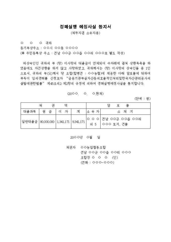 경매실행 예정사실통지서(채무자사망)