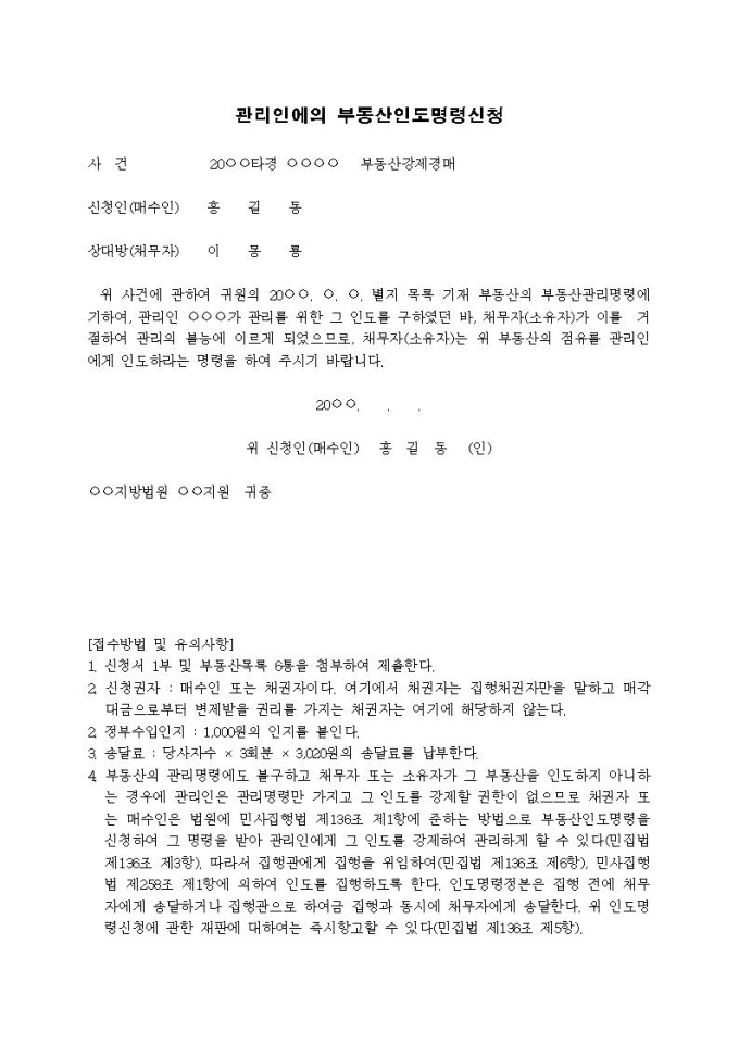 관리인에의 부동산인도명령신청서입니다.