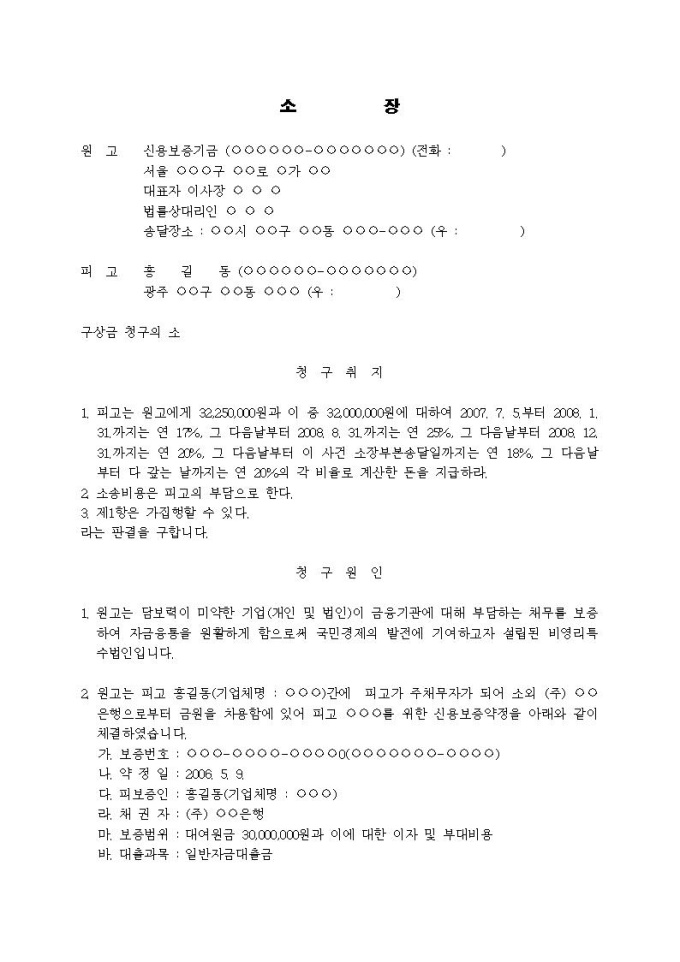 9,000원/월구상금청구 소장(신용보증기금의 대위변제)입니다.