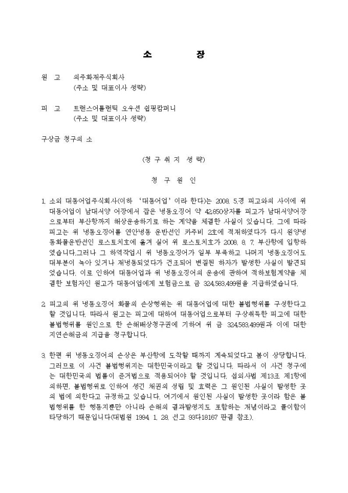 구상금청구 소장(적하보험계약, 불법행위, 보험자대위, 섭외사건, 준거법)